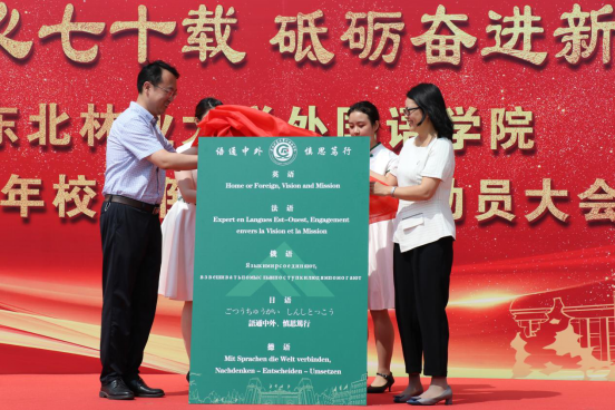 由李明泽处长、董辉院长为必赢3003no1线路检测中心院训揭幕。学院教师代表王清扬、文慧超、孟繁君、李霞、栾慧鑫宣读英、日、俄、法、德五种语言版本院训,阐述了希望外语学子今后在国际舞台上发出中国声音,为东林代言的美好寓意。